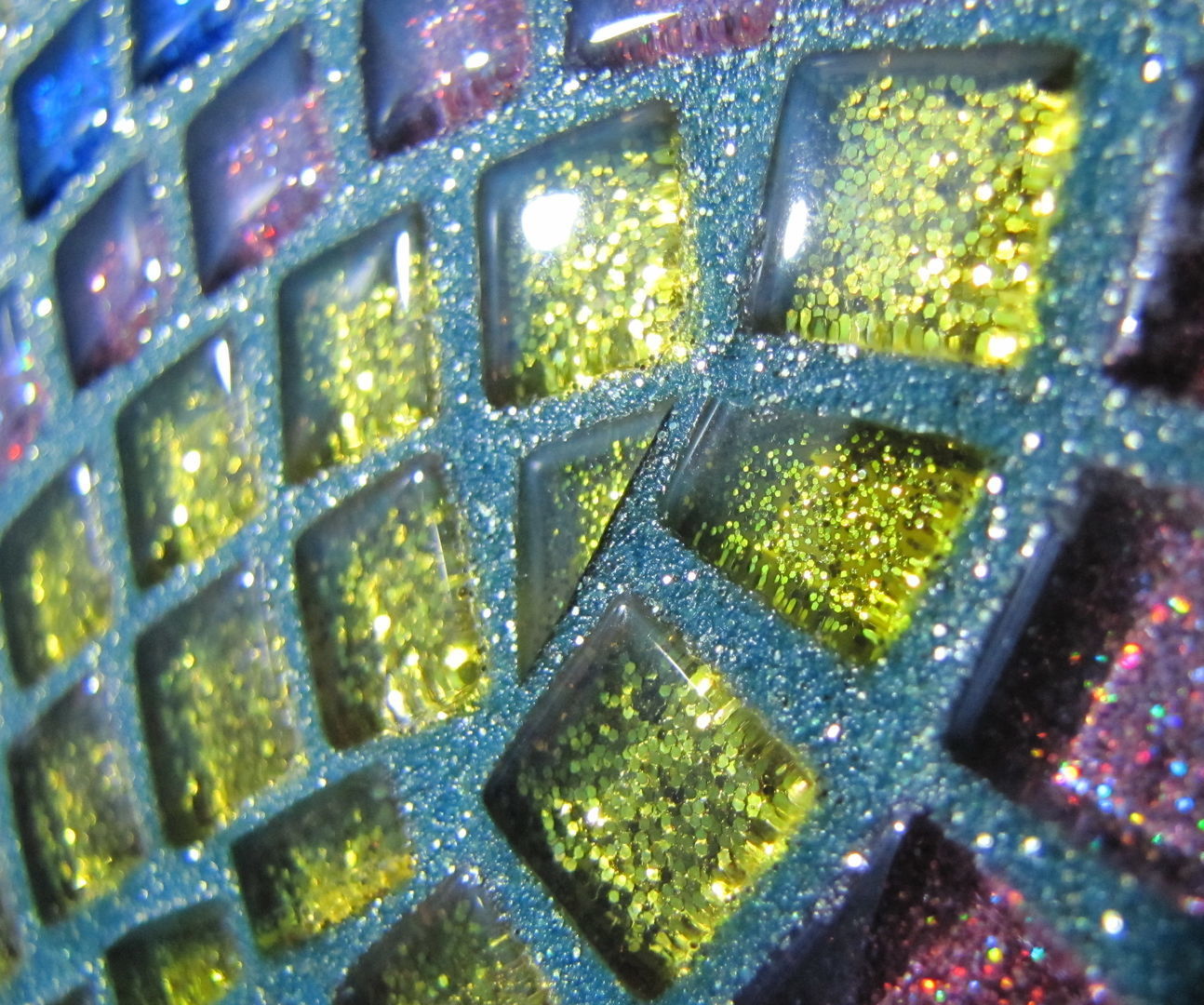 Однородную. Маленькие стеклянные плиточки могут напоминать своим глянцем леденцы или, если они матовые, стеклышки, выброшенные морем на берег. Стеклянные кубики могут быть декорированы блестками, фольгой и т.д.