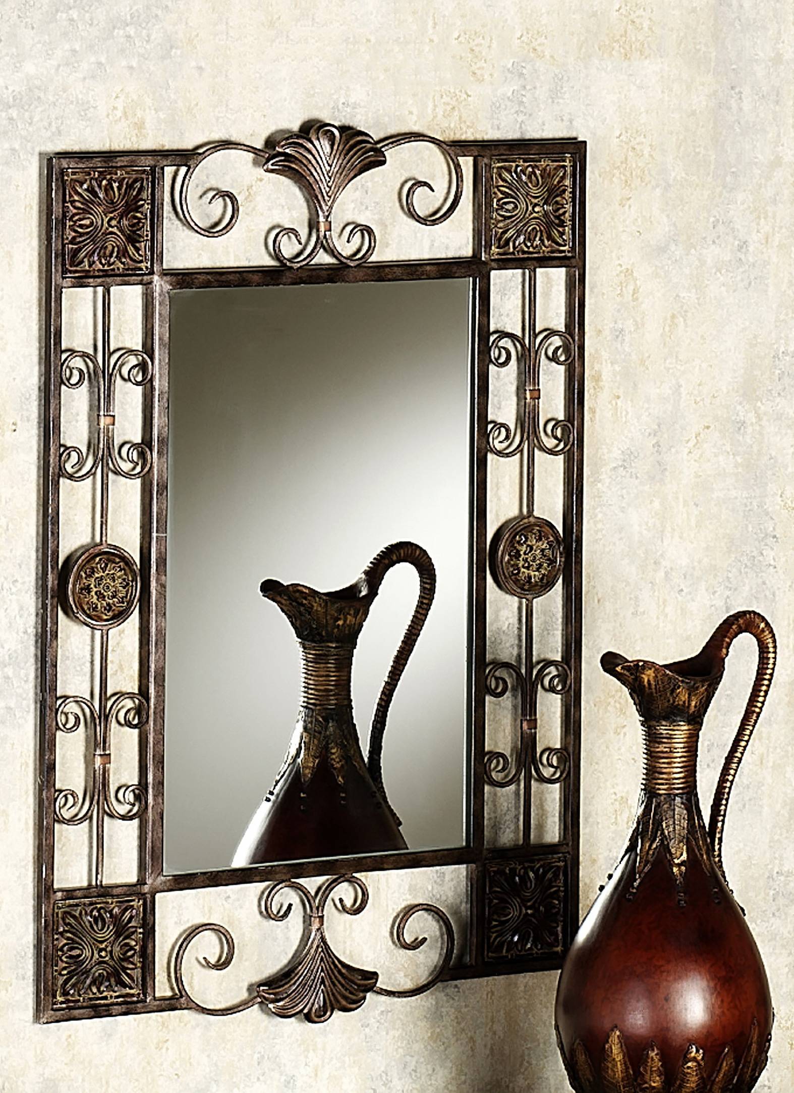 - Если вам необходимо подчеркнуть изящество и утонченность обстановки, то лучше всего выбрать для прихожей навесное зеркало в кованой или резной раме. Лучше выбрать модель среднего размера, установив рядом с ней дополнительные источники света. Хорошо, если это будут настенные бра, выполненные в том же стиле, что и рама, обрамляющая зеркало. В этом случае в качестве дизайнерского украшения идеально будет смотреться художественная ковка;