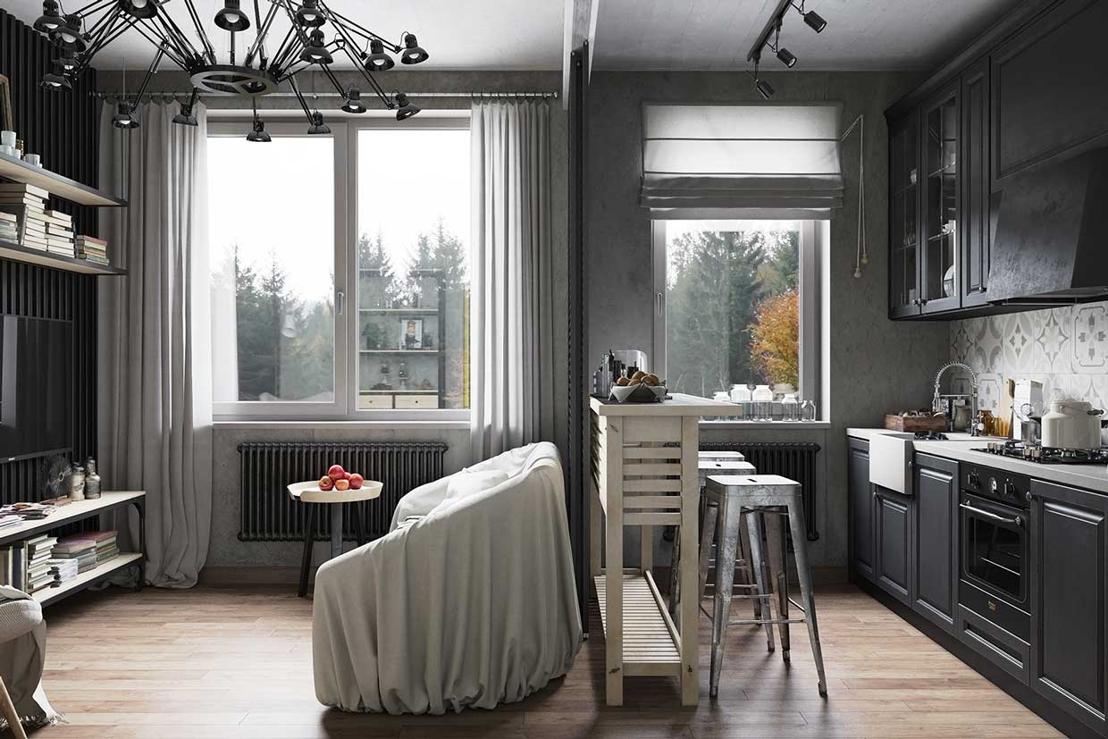 Этот тип интерьера предполагает частичное расположение мебели по центру, в виде островка, или полуостровка (у стены), отдельно от основного ряда шкафов, на площади достаточной квадратуры с учетом количества членов семьи, их предпочтений, что вполне приемлемо для одного человека или пар без детей. Остров — это обеденная зона, варочная поверхность и место для хранения, имеющая современный стильный вид.