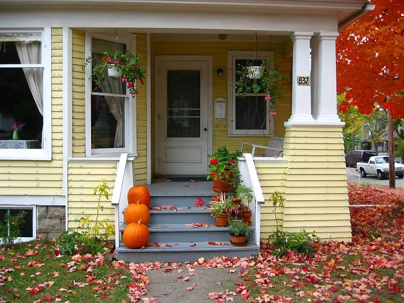 Если фасад здания оформлен в стиле кантри, то логичным продолжением этой стилистики станет и декор крыльца с обильным применением деревянной отделки и элементов загородной жизни.