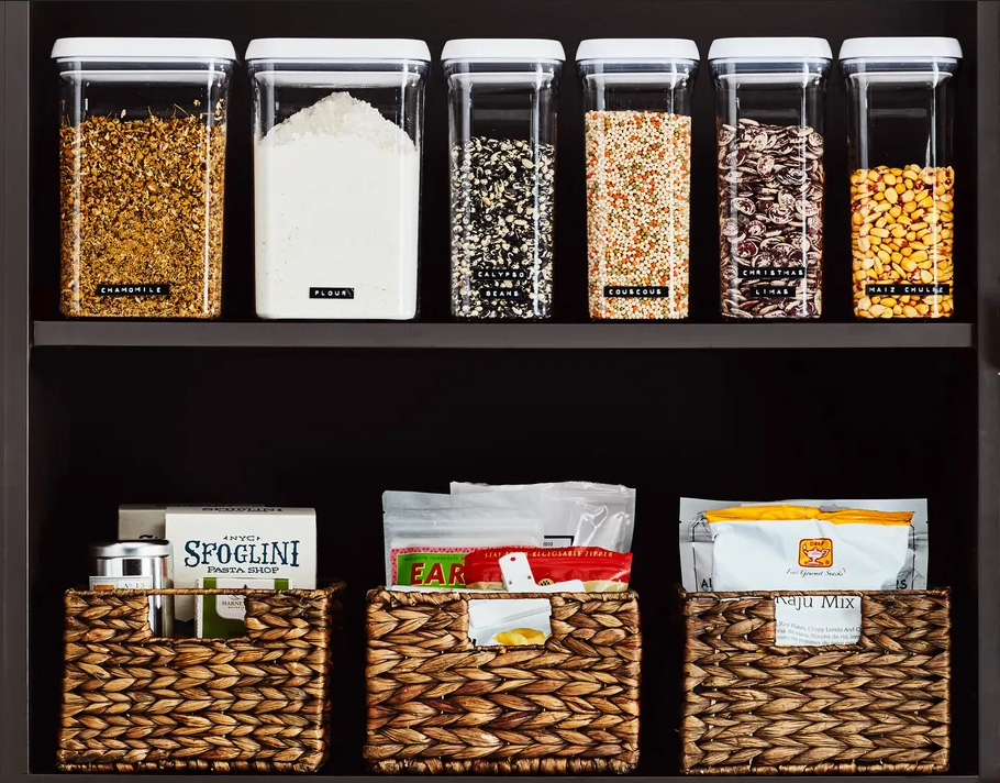 Следующее комбинированное хранение — это крупы. Здесь можете сами решать, как правильно разложить их у себя. Но специальные пластиковые контейнеры для этого очень удобны. Есть даже специальные коробочки, разделенные на 2 секции. В одну можете засыпать манку, а в другую — рис.
