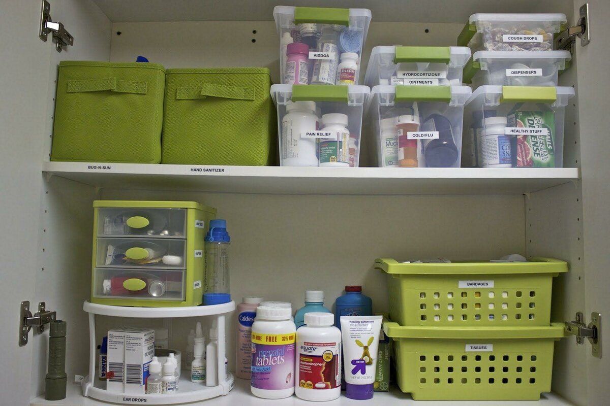 То же самое касается и лекарств. Они всегда должны находиться на нижних полках в шкафах. Удобно их хранить в прозрачных контейнерах.