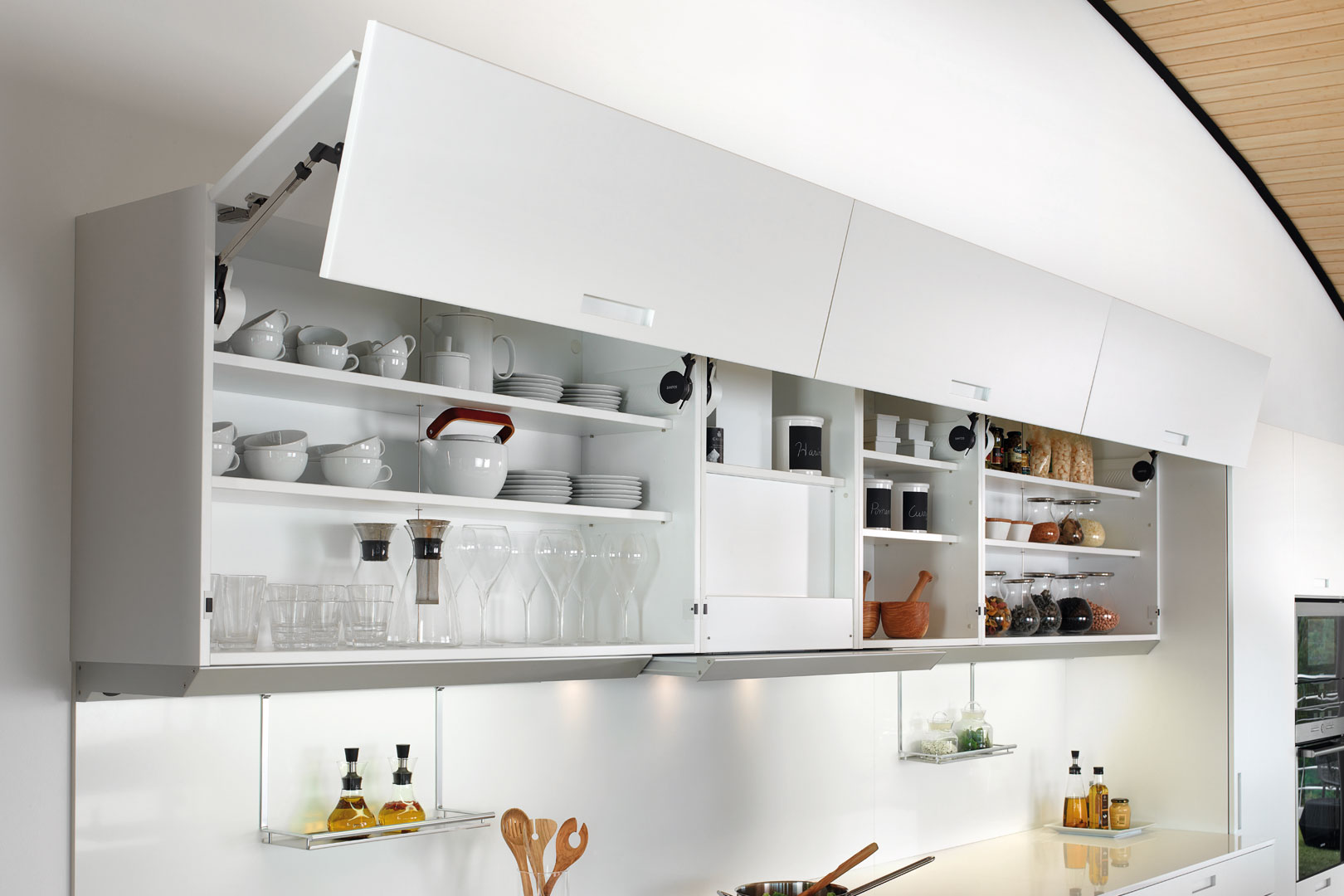Современная фурнитура для шкафов оснащена поворотным механизмом, который устанавливается на дверцу. При открывании нижней секции выдвигаются полки или корзины. Такой крепеж помогает легко достать вещь с дальних углов мебели.