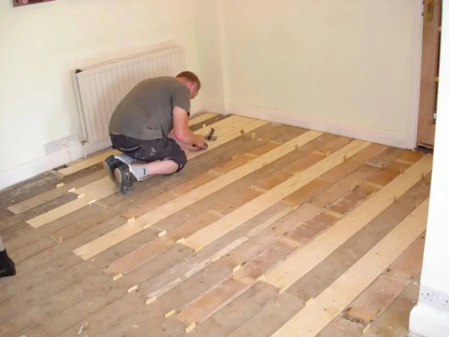 - Демонтаж плинтусов и ремонт пола. Плинтусы убирают, гнилые элементы заменяют новыми, скрипящие половицы прикручивают, прогибающиеся – крепят более надежно (через каждые 40-50 см). Всю площадь пола проверяют на наличие перепадов, зазоров, скрипа. Рассохшиеся и сильно поврежденные доски сверху обшивают ДСП или фанерой толщиной 14 мм. Для предотвращения скрипа под фанеру в щели насыпают мел.