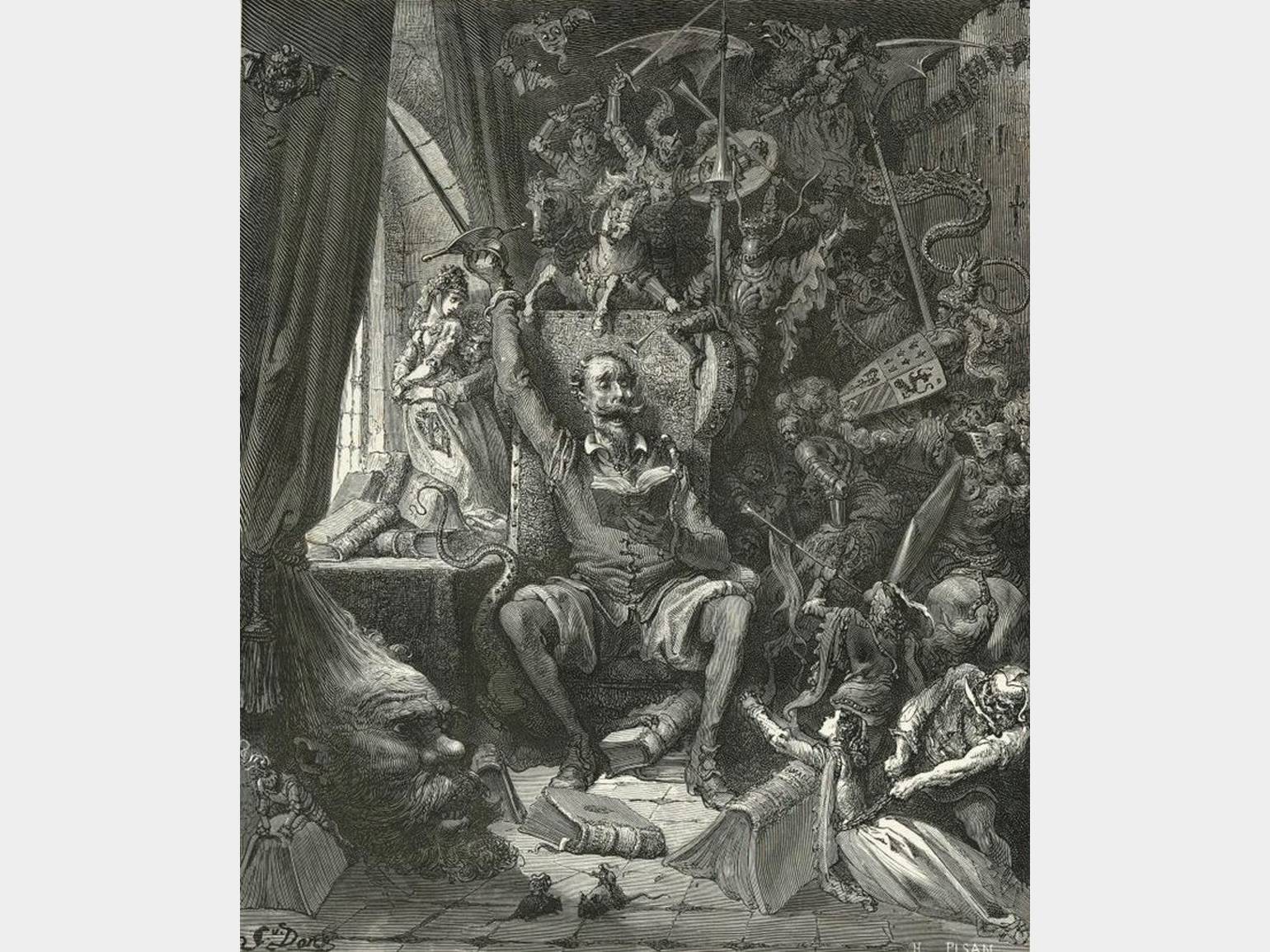 Фронтиспис — рисунок перед первой страницей книги — к «Дону Кихоту». Герой изображён среди своих видений из рыцарских романов. Иллюстрация: Гюстав Доре / иллюстрация к роману «Дон Кихот» Мигеля де Сервантеса