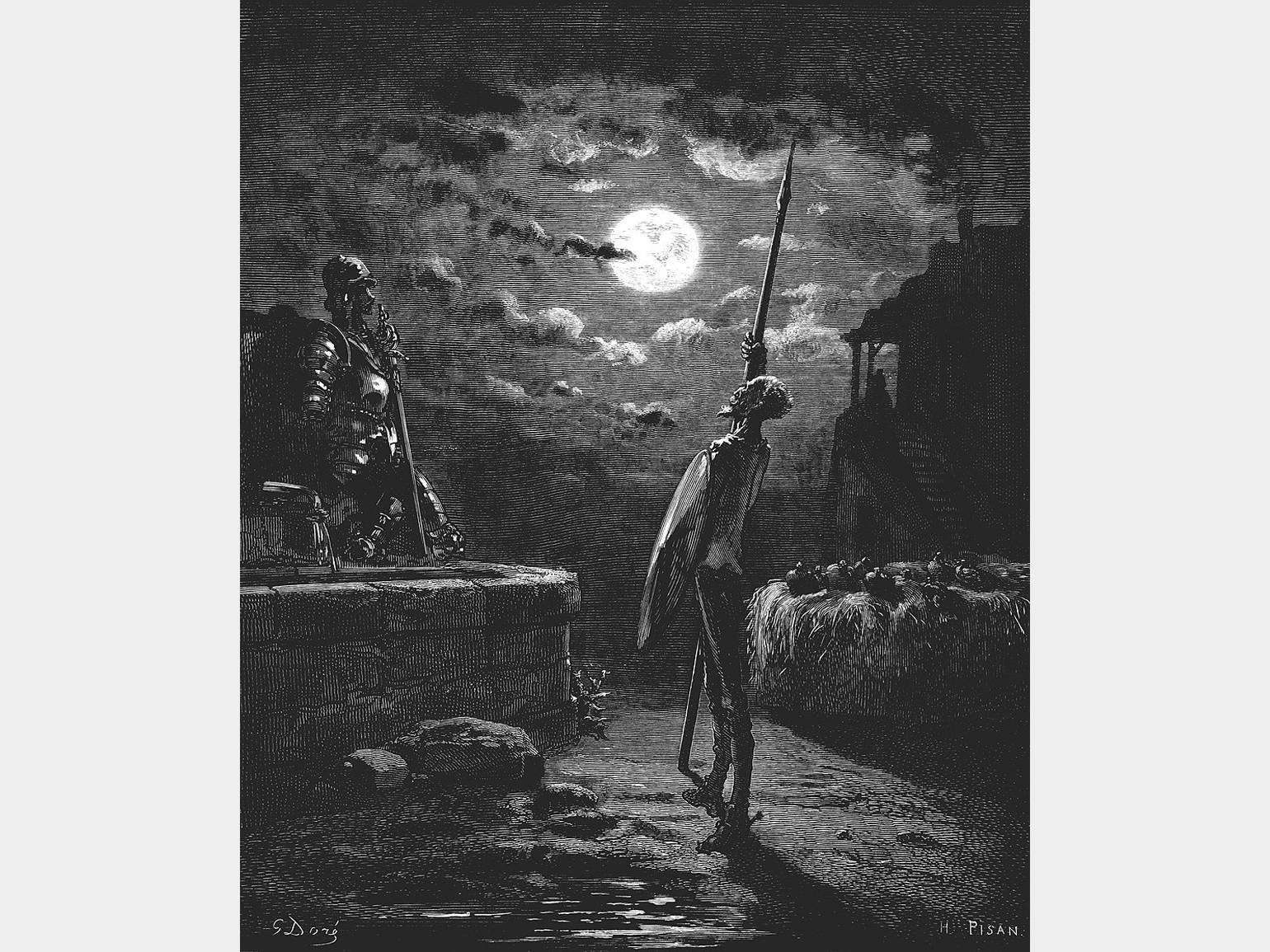 Дон Кихот принимает пустые доспехи за живого рыцаря. Иллюстрация: Гюстав Доре / иллюстрация к роману «Дон Кихот» Мигеля де Сервантеса