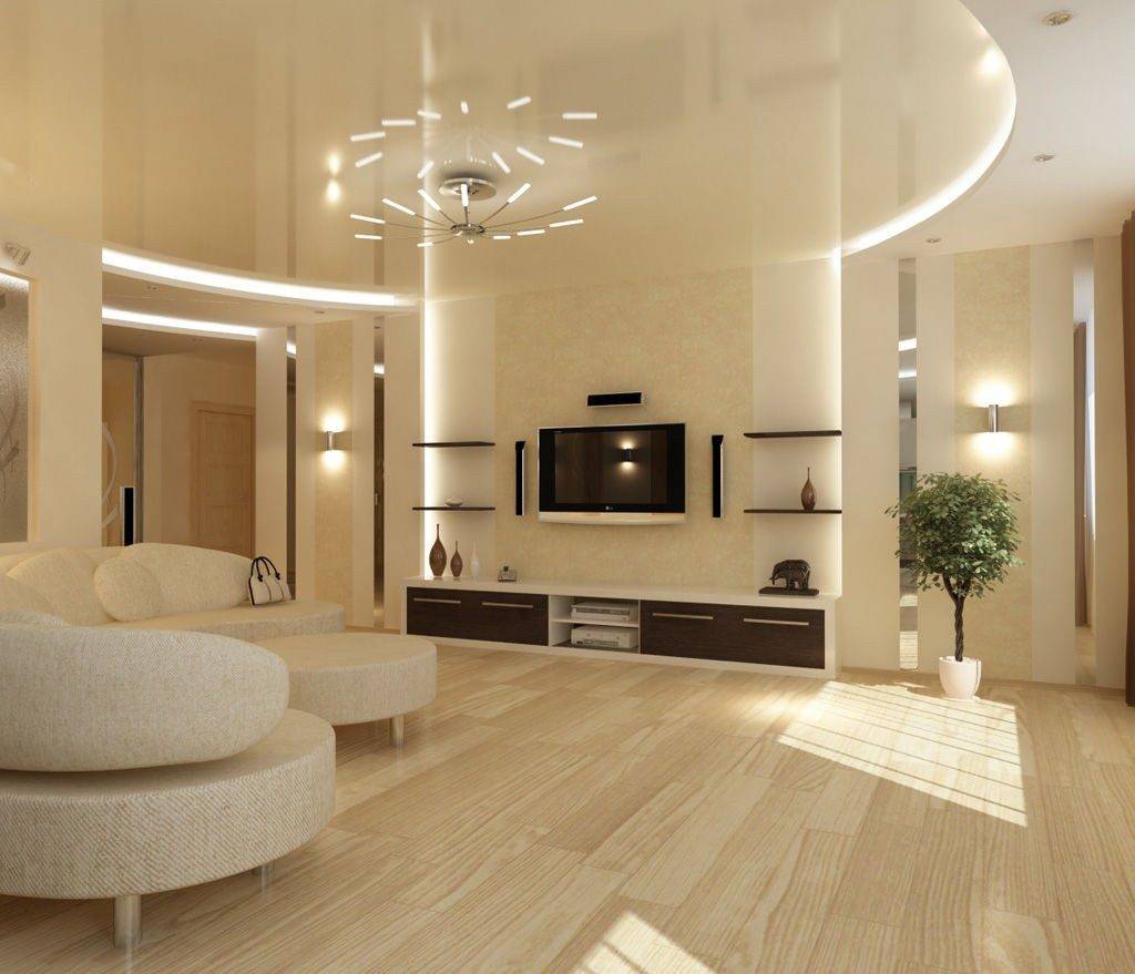 В интерьере зала популярно применение штукатурки, покраски, установка подвесного или натяжного полотна. Для малогабаритного помещения в хрущевке с низким потолком не подойдет сложная многоуровневая конструкция. Лучше всего на потолке в гостиной будет смотреться покрытие в виде глянцевой пленки, отражающей свет и зрительно расширяющей пространство.