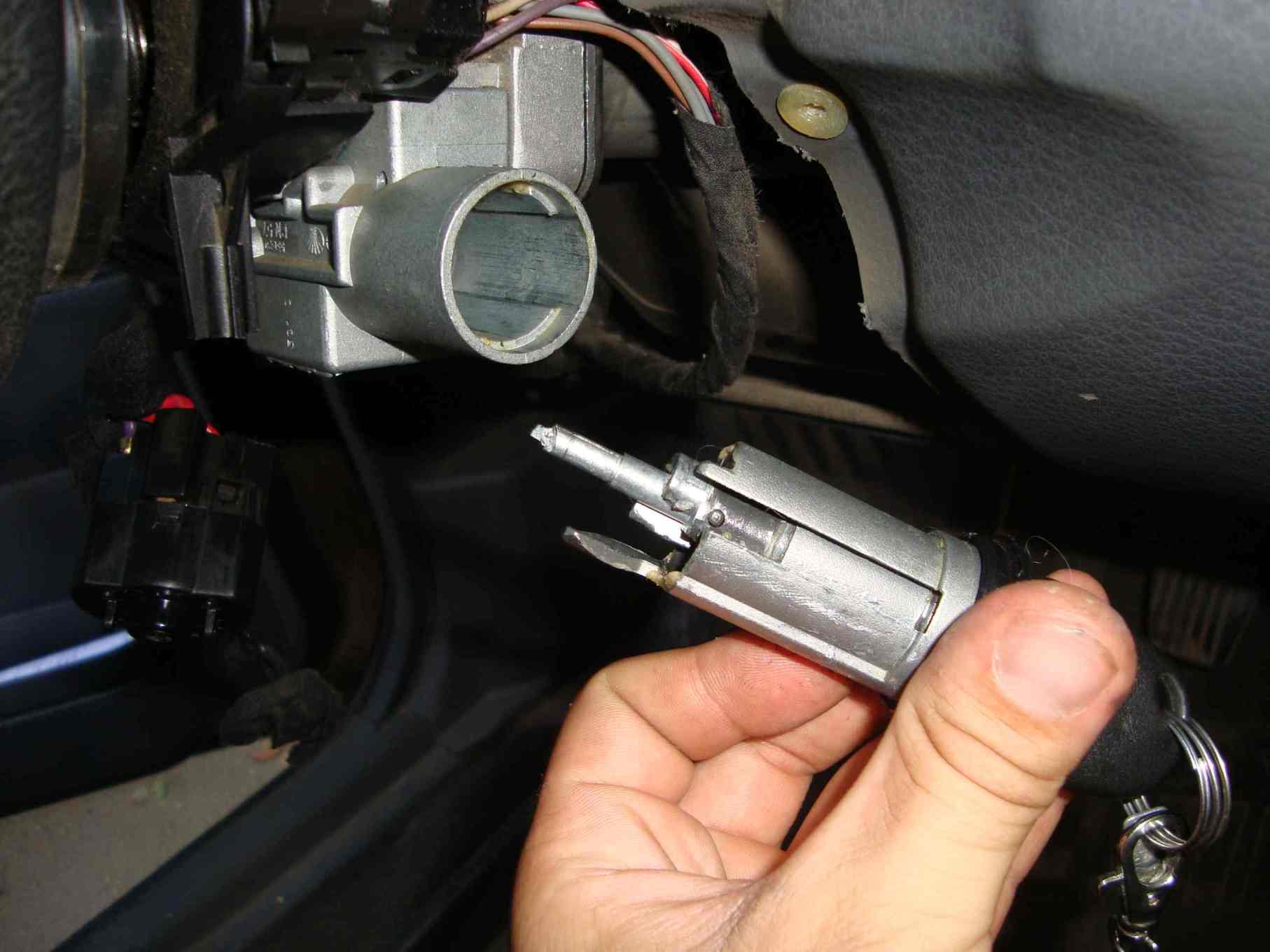 - Если есть флажок, препятствующий извлечению поврежденной части, надавливаем на него и извлекаем личину. Можно вставить ключ в отверстие, повернуть его и потянуть на себя.