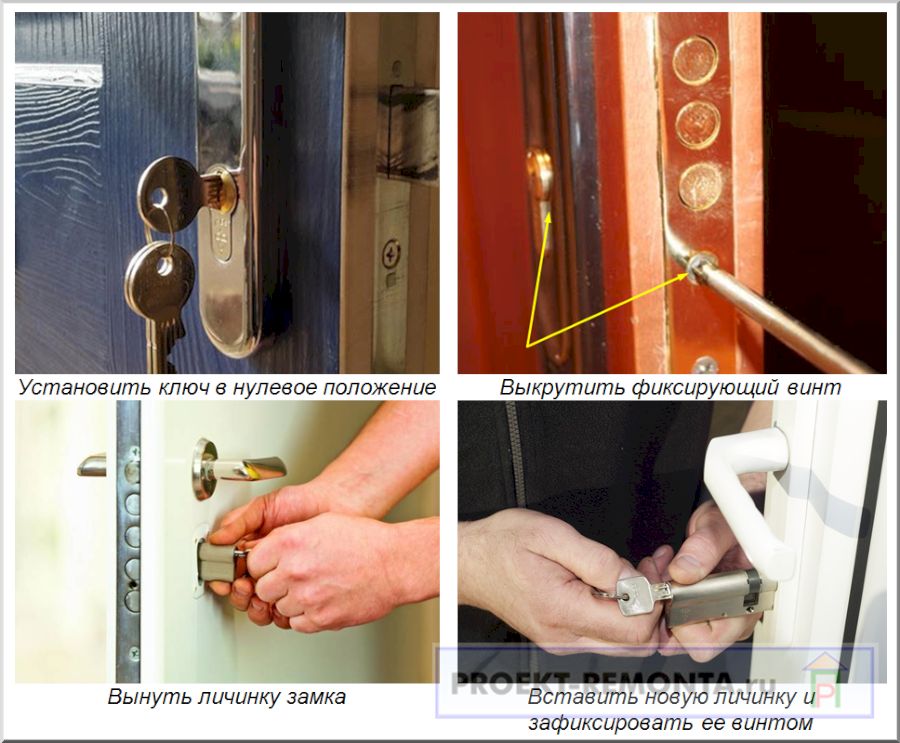 При желании можно попытаться самостоятельно заменить личинку замка двери, выполнив следующие действия:
