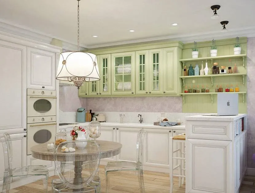 Мятный. Цвет из холодной палитры, который подойдет для кухонь, расположенных с юга и оформленных в стиле прованс или шебби-шик. Он наполняет дизайн нежностью и свежестью;