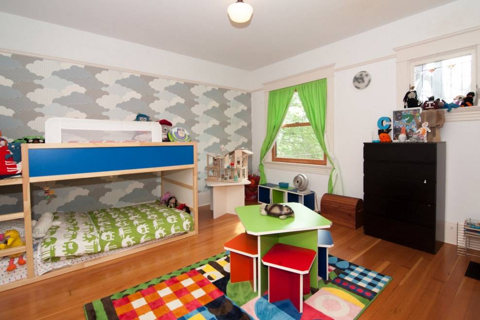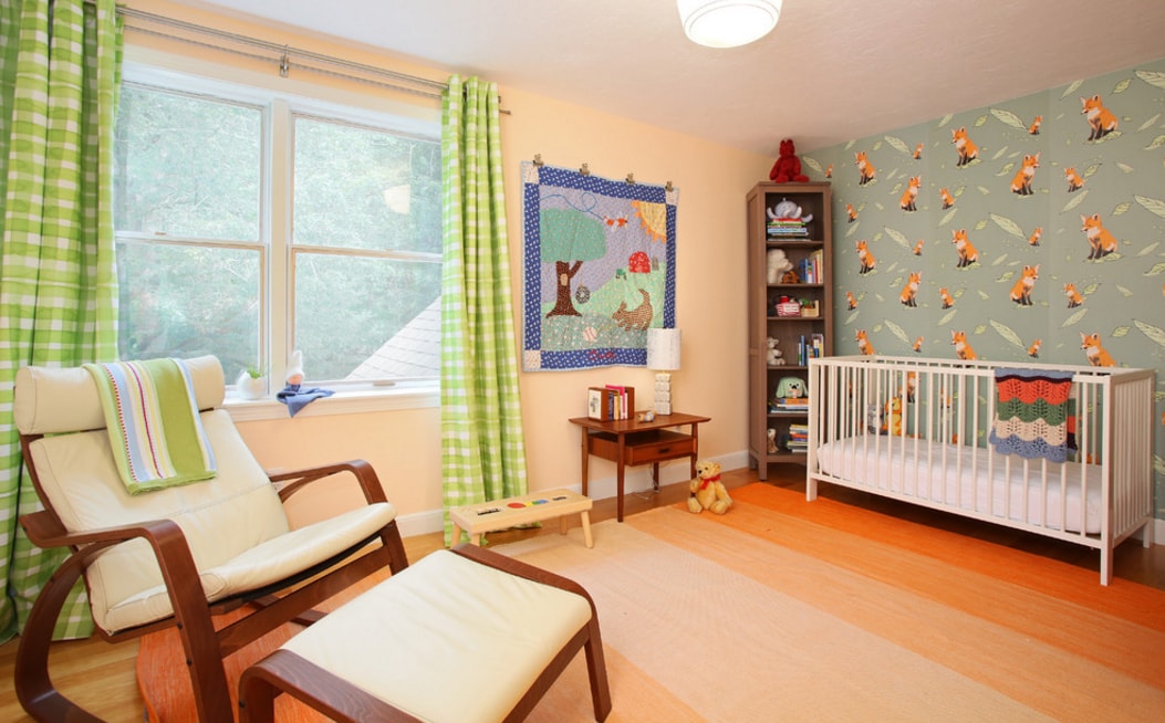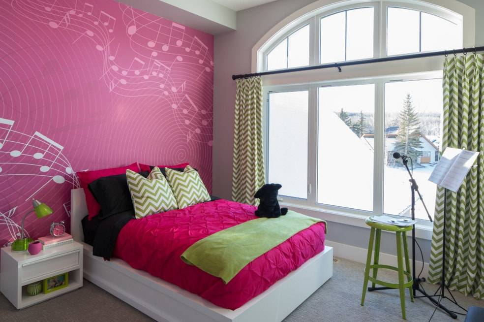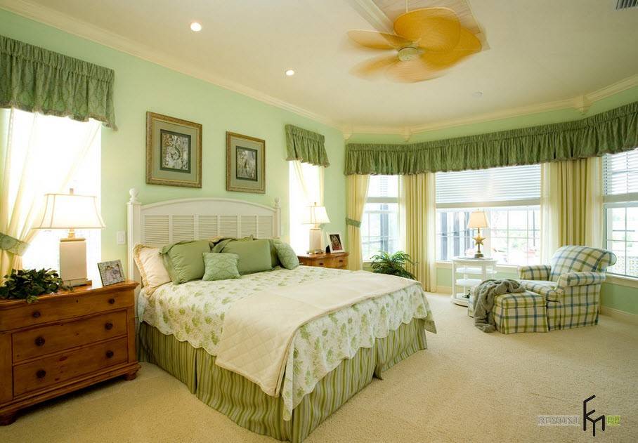 Чтобы визуально увеличить комнату, к светло-зеленым обоям подбирают фисташковые шторы. Если стены бледные, то драпировки на окна должны быть немного ярче и наоборот.