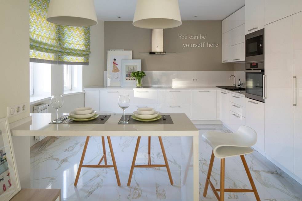 | Средиземноморский | Самое необычное, сказочное решение. Палитра может быть яркой: изумрудной, лимонной. Обеденную зону можно оставить нейтральной. Стол, стулья могут иметь природный древесный рисунок. Фартук должен быть сделан из плитки, стекла. |