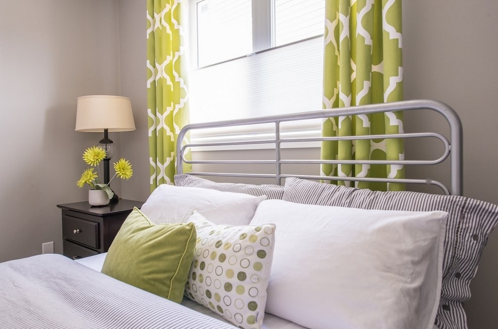 Простая ткань в руках мастера обретает новую жизнь. Это относится и к пошиву штор в спальню. На общий вид занавесок в травянистых тонах влияет способ крепления: