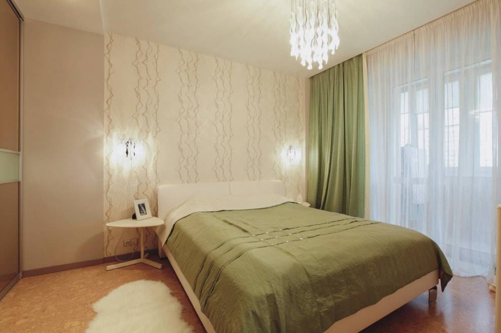 Многих людей интересует вопрос о том, какие шторы выбрать под зеленые обои в спальне. Отлично смотрятся гардины с принтом, которые комбинируются с белым тюлем. Можно использовать занавески пастельных тонов.