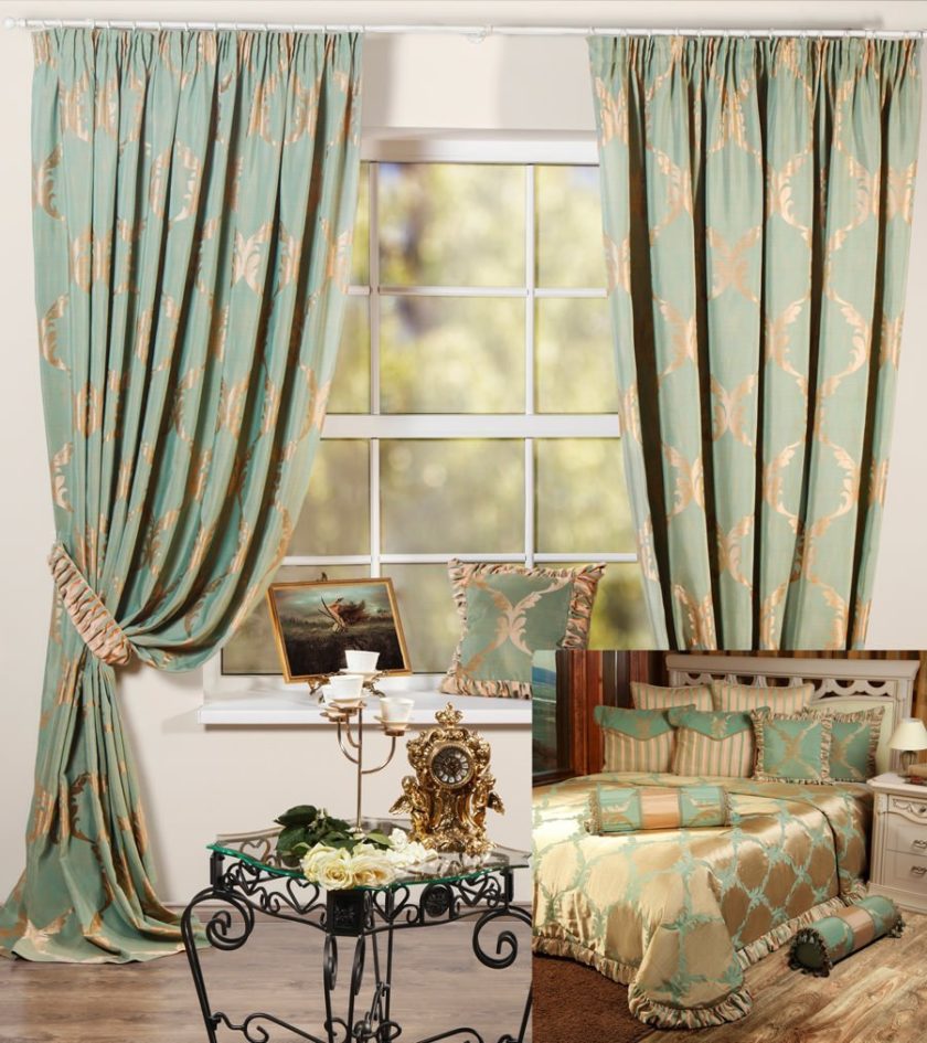 Другие предметы меблировки должны перекликаться по цветовой гамме со шторами. Иными словами, используемый текстиль должен перекликаться по цвету с зелеными шторами. Это касается пледов, подушек, ковров.