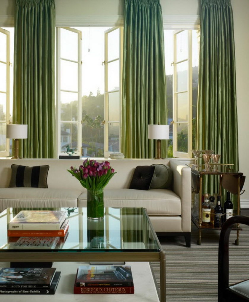 А вот зеленые шторы в гостиную могут быть и велюровыми, и бархатными, конечно, если правильно подобрать их стилистическое оформление.