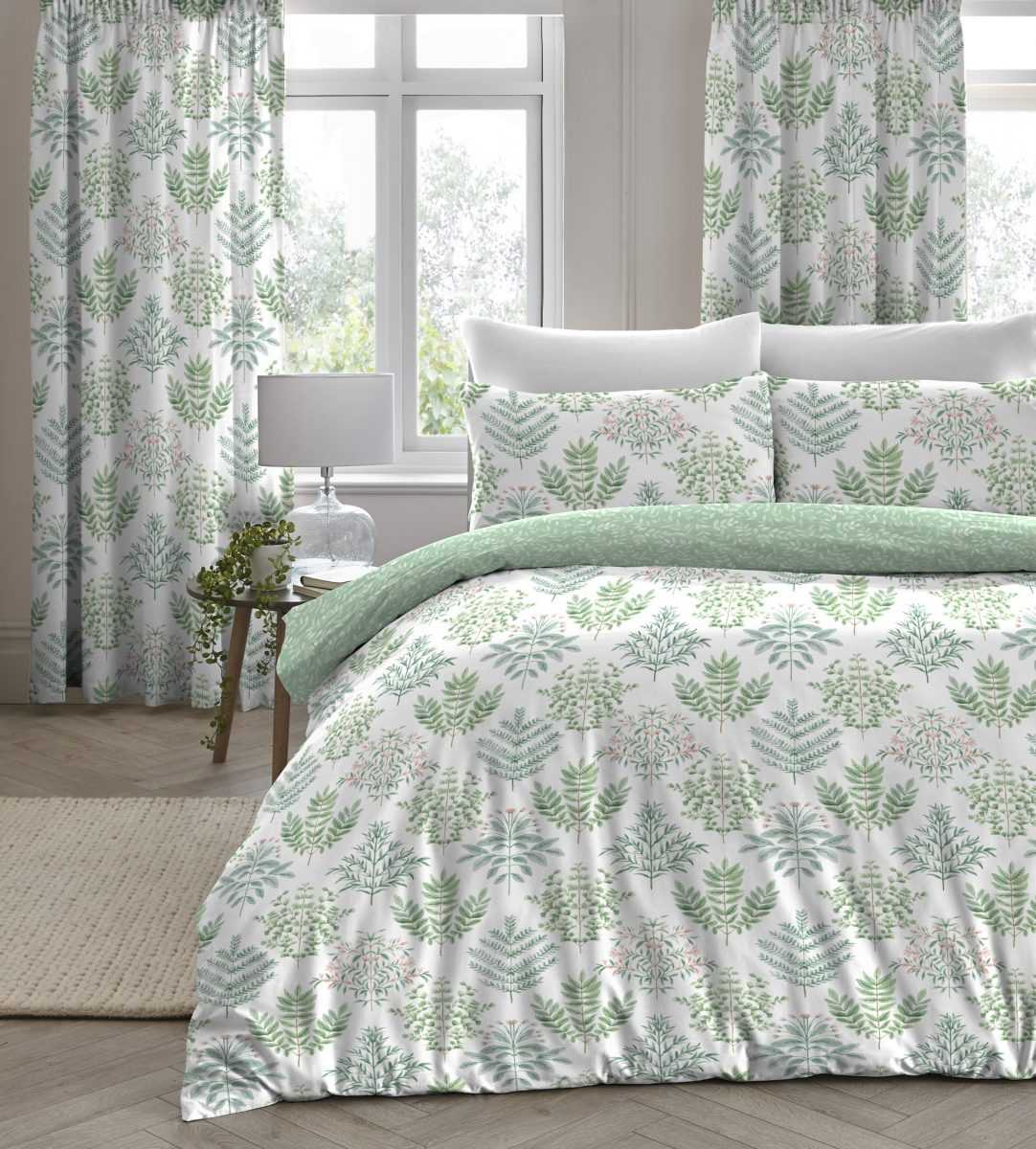 Зеленые портьеры — отличный выбор для маленькой спальни