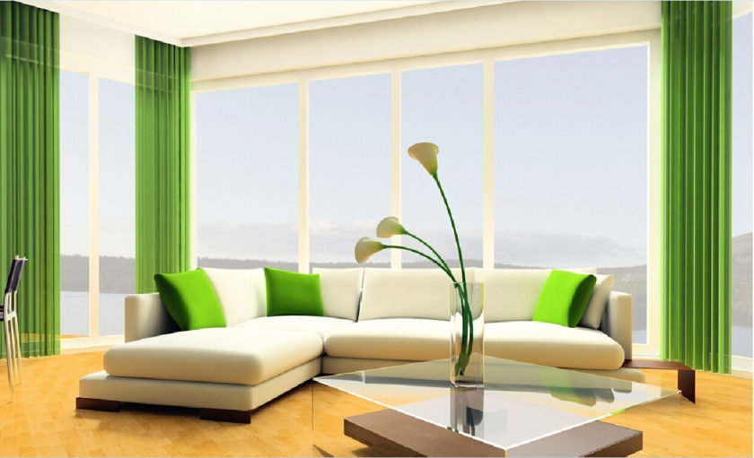 Рисунок 1. Большие окна можно обыграть различными ансамблями из штор и тюля зеленых оттенков.