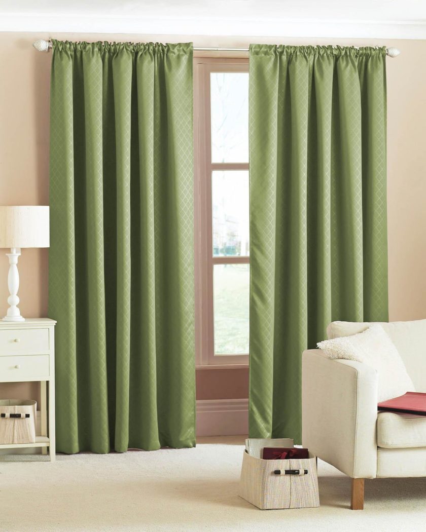 Зеленые шторы придадут помещению яркость и добавят комфорта на фоне белого потолка и стен. Со светлой мебелью и остальными аксессуарами они освежат его, сделают легким.