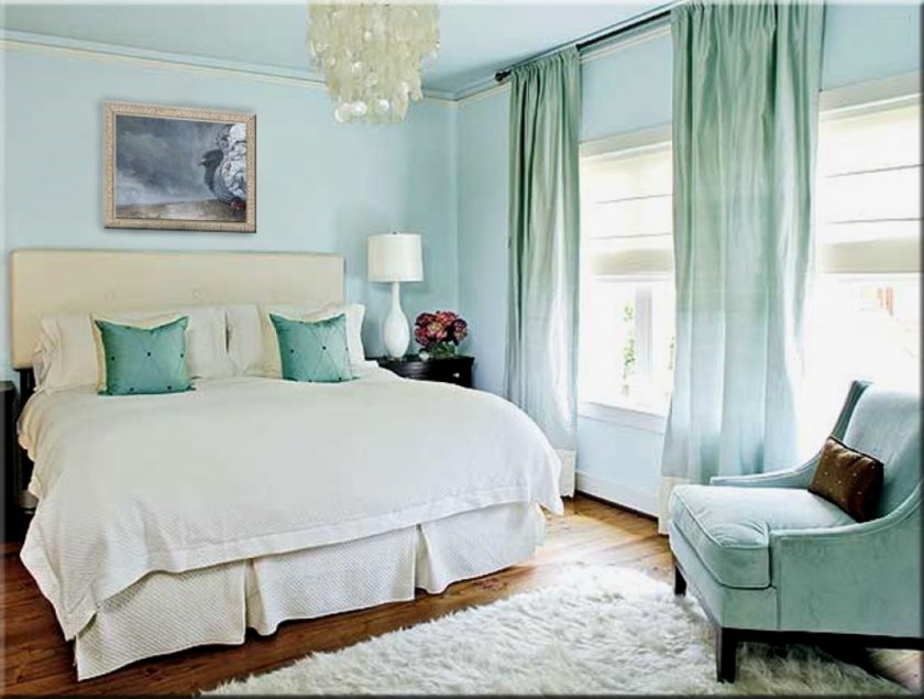 Немного романтичности и расслабленности привнесут белые, бежевые, розовые, васильковые, светло-желтые портьеры в спальню. Очень приятное сочетание спокойного светло-зеленого оформления стен с коричневыми обоями.