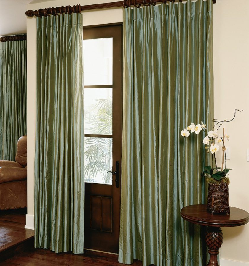 - Льняные зеленые шторы в зал выбирают для стиля прованс или кантри. Они могут быть разными по плотности, поэтому выбор зависит от того, насколько функциональными должны быть портьеры.
