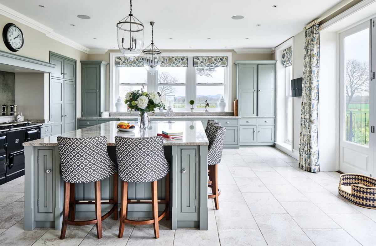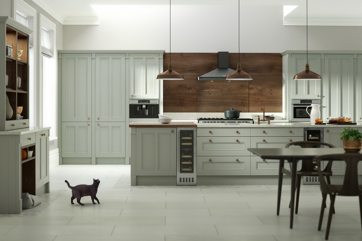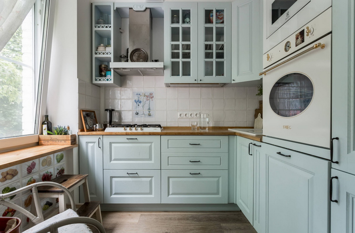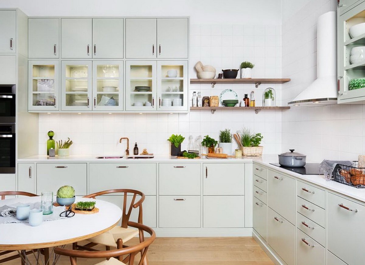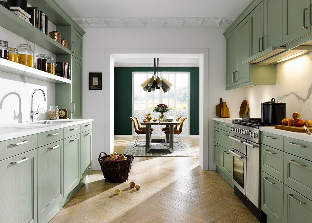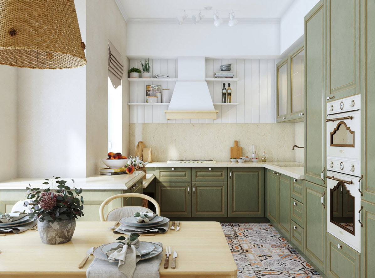 Если кухонные шкафчики украшены филенками или резьбой, подбирайте более глухие тона салатового, будто выцветшие под солнцем. Фасады могут быть украшены элементами белого, серебристо-серого или бежевого цвета. Со светло-зелёной гаммой хорошо сочетается натуральное дерево, тёмное или светлое, а также керамика естественных цветов.