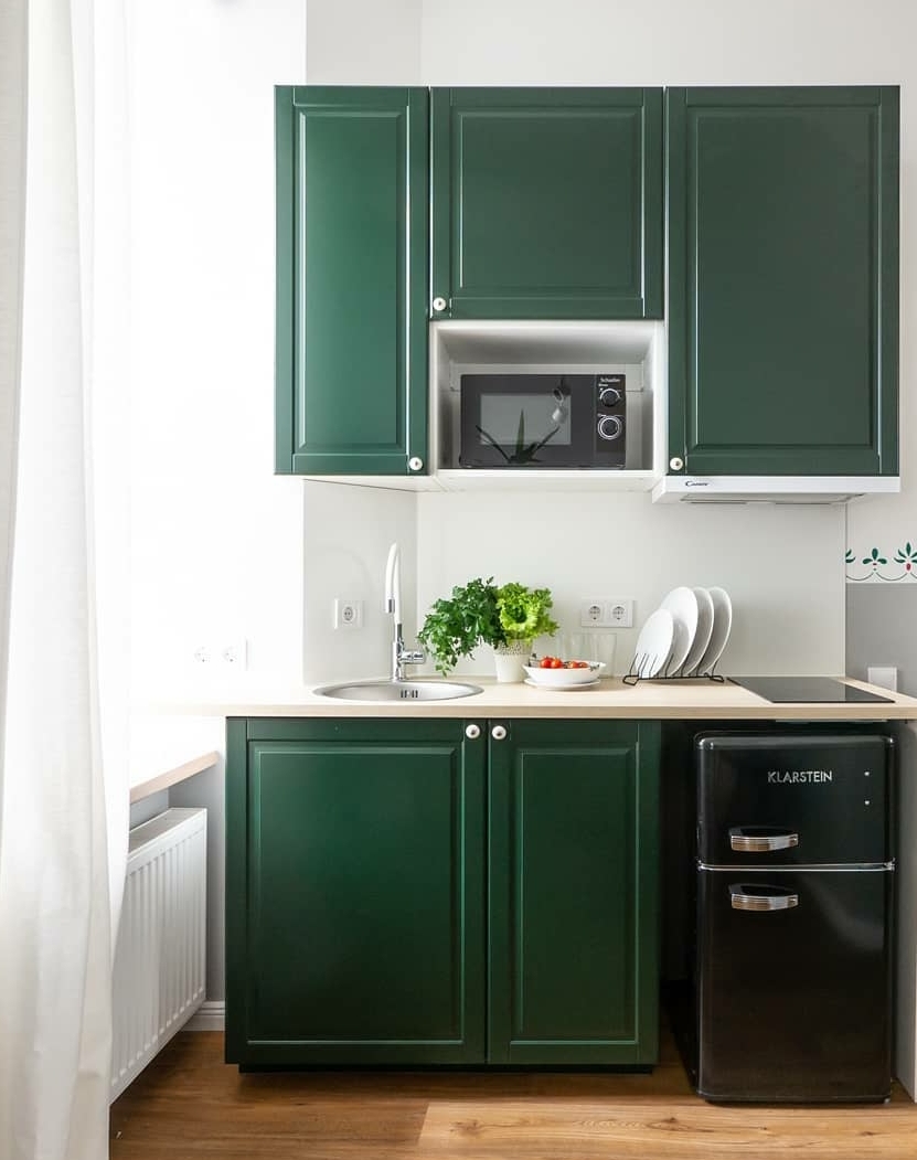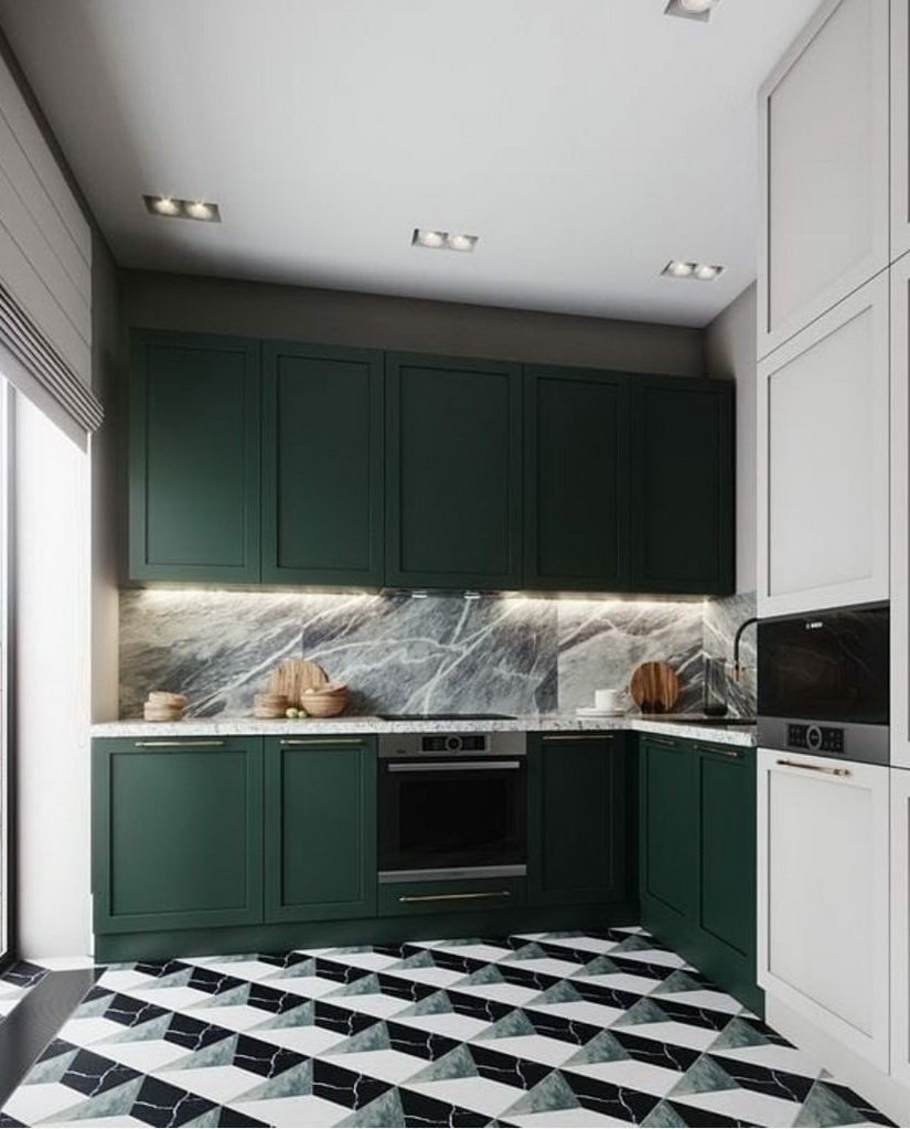 Зеленые кухонные шкафы можно использовать во всей маленькой кухне. Убедитесь, что их можно уравновесить столешницами и полом другого цвета, чтобы помещение не выглядело слишком зеленым.