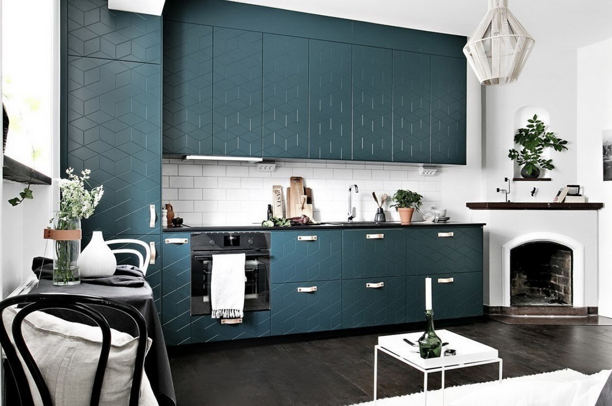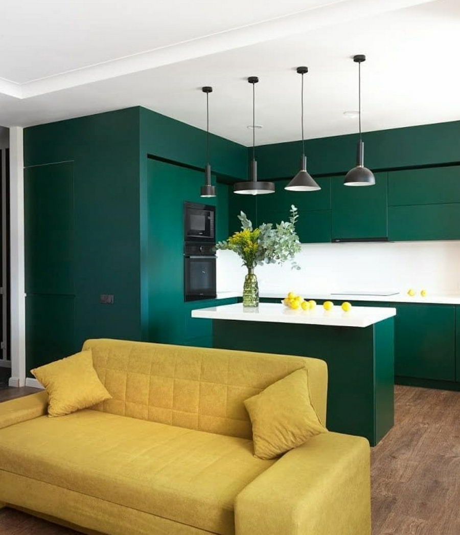 Этот тон хорошо сочетается с золотом, что можно выгодно обыграть с помощью техники, элементов декора и отделки. Единственный нюанс – обилие изумрудного не подойдет для очень маленькой кухни. Этому цвету нужен простор, чтобы не выглядеть «тяжелым» и мрачным.