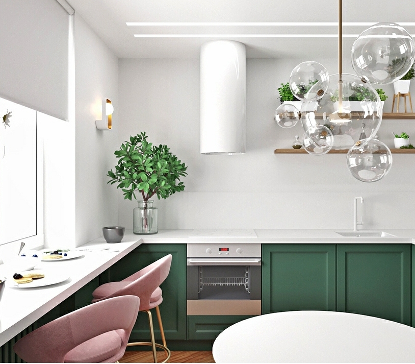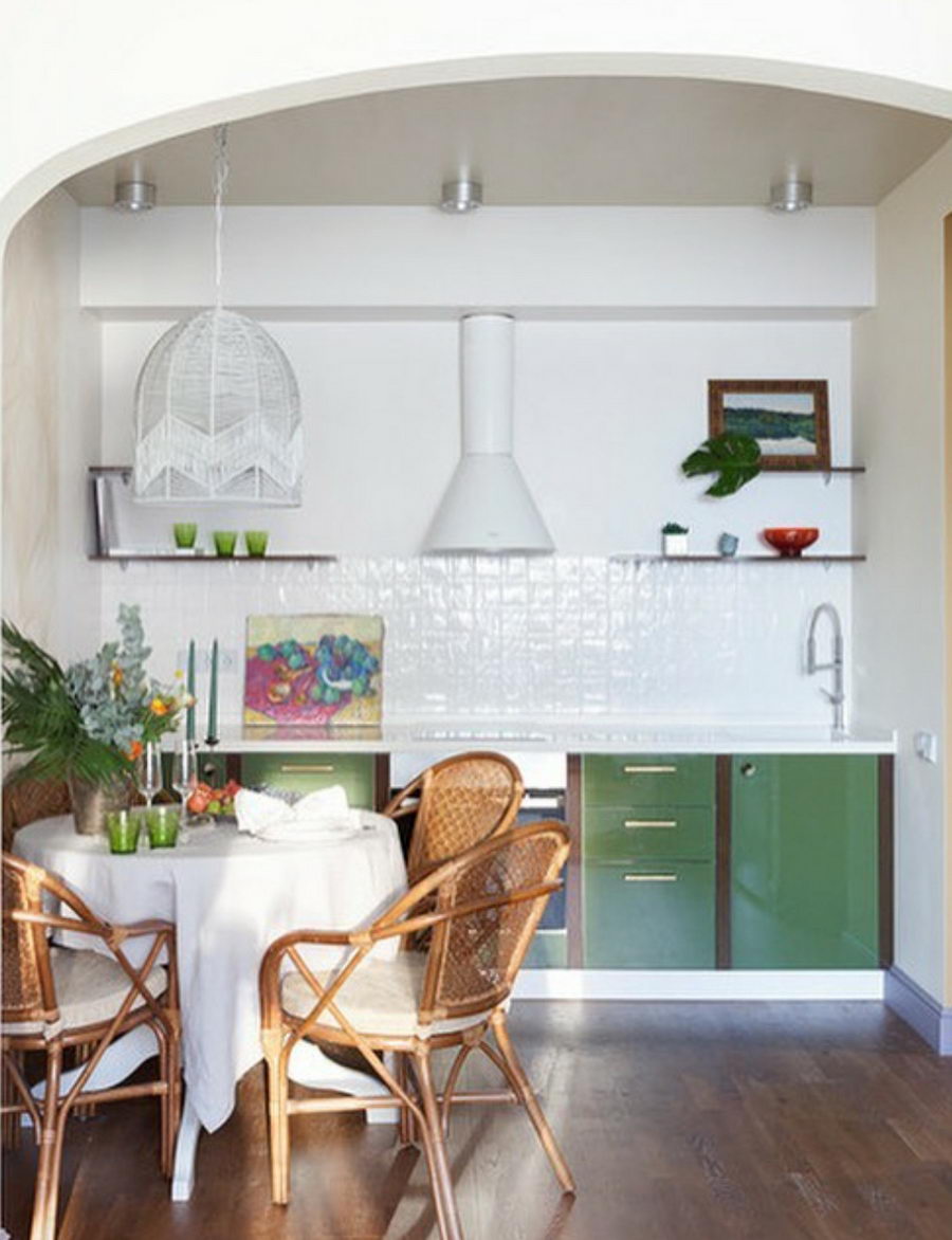 Некоторые сочетания зелёного и белого воспринимаются особо гармонично. Например: белый фон (гарнитур, техника, стены). Акценты ярких, почти кислотных цветов: стулья, занавески, светильники, посуда.