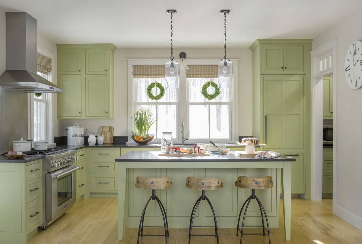 Светлый мятный – лучший фон для простеньких росписей в цветочек на деревянных фасадах. Стиль кантри позволяет сочетать современную технику с деревянной крашеной мебелью. Белым может быть кухонный стол, возле которого стоят зелёные венские стулья. Кантри допускает использование множества оттенков этого цвета с мелкими разноцветными пятнышками. Главным акцентом могут быть клетчатые полотенца и занавески с оборками.