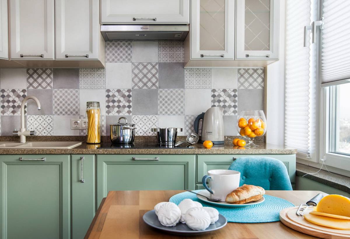 Стильный кухонный гарнитур салатового оттенка смотрится очень выигрышно на фоне мозаичной кладки фартука