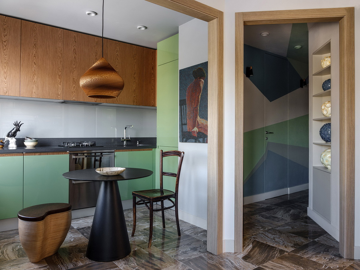 Салатовый цвет очень хорошо сочетается с деревянными поверхностями