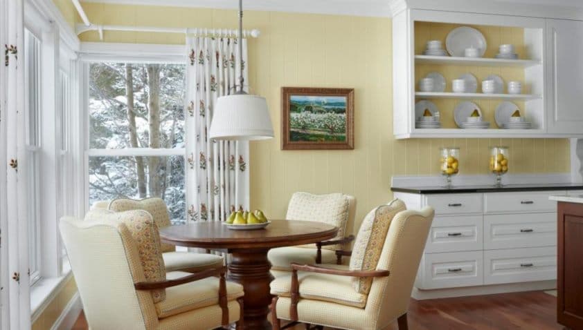 - Стандартное сочетание предполагает использование пастельных желтых оттенков со светло-серыми оттенками. Внутри этого можно добиться, покрасив стены в светло-желтый цвет и применив серую обивку мебели или серо-желтый узор на шторах и полках для диванов.