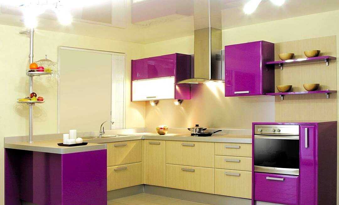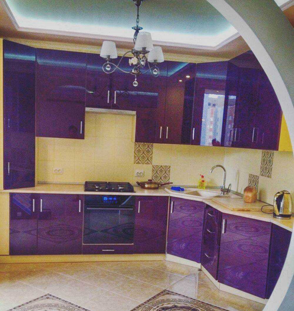 Фото кухонного дизайна желтого и сиреневого цвета.
