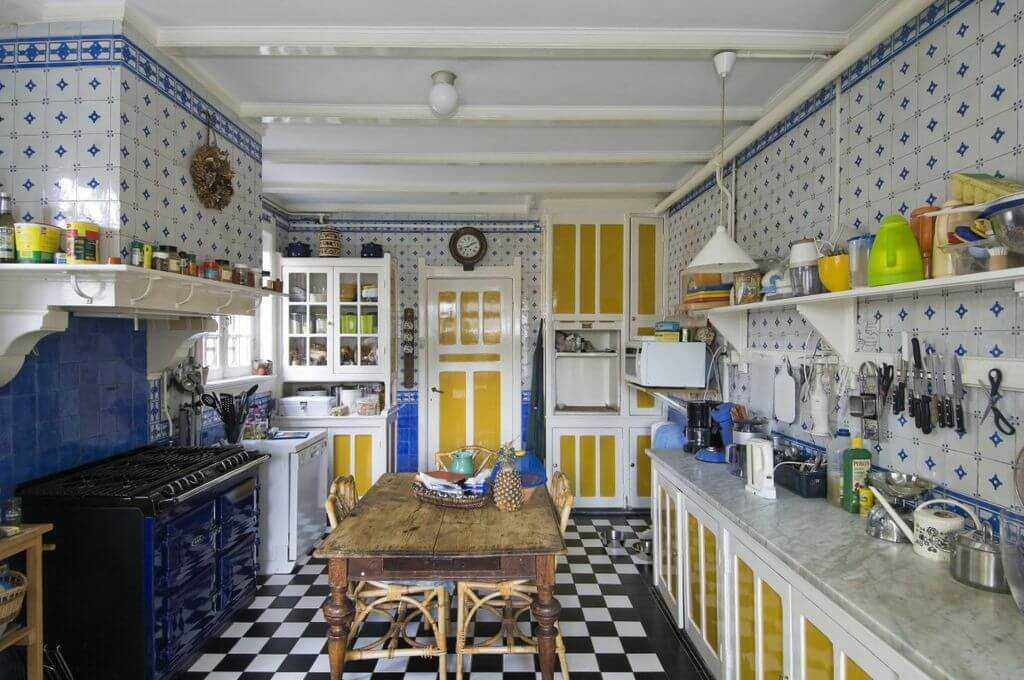 - Использование желтого и синего придаст кухне средиземноморский колорит. Стены кухни можно окрасить насыщенным желтый оттенком. Мягко дополнять его будут изделия из дерева, клетчатые ткани для занавесок, скатертей синего.