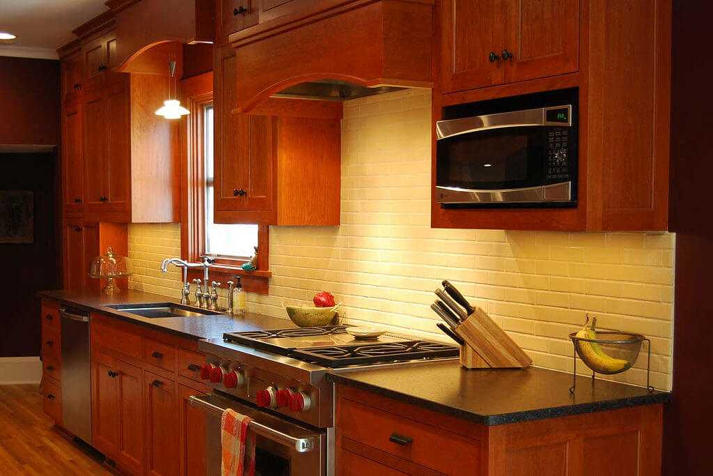 На кухне же в классическом стиле, кантри, американской классике или в стиле прованс будут уместны приглушенные тона: горчичный, оливковый, песочный, светло-желтый, кремовый, льняной, палевый, персиковый. Кстати, этими сдержанными оттенками допускается оформлять как стены, так и кухонный гарнитур.