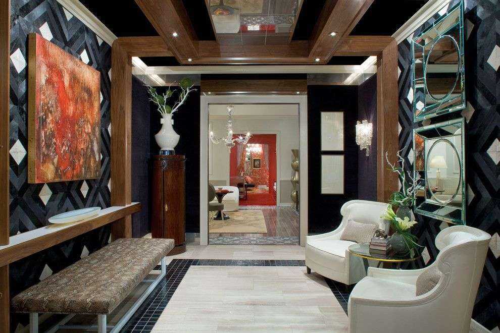 - Прихожая. Во многих квартирах прихожие небольшие, потому дополнительно увеличить комнату при помощи потолка с зеркальной поверхностью не будет мешать. Можно создать акцент над дверью, можно создать весь потолок отражающим — все зависит от желания.