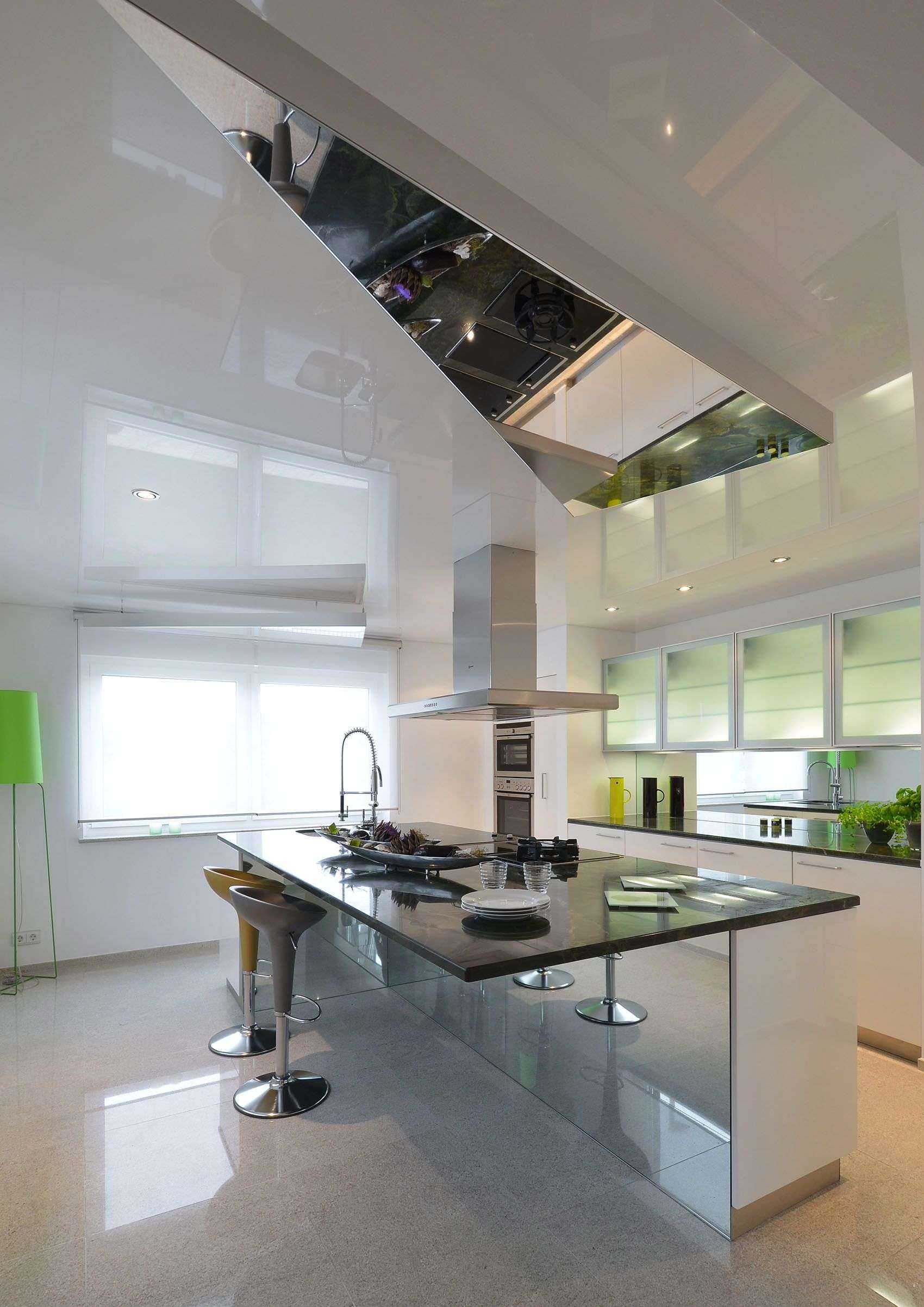 - Кухня. Спорное решение, потому как тут регулярно меняется температура, льется вода и появляются чрезвычайные ситуации. Полностью весь потолок зеркальным тут лучше не делать, но вот применять его, как акцент над зоной для обеда — хорошая идея. Это выглядит великолепно.