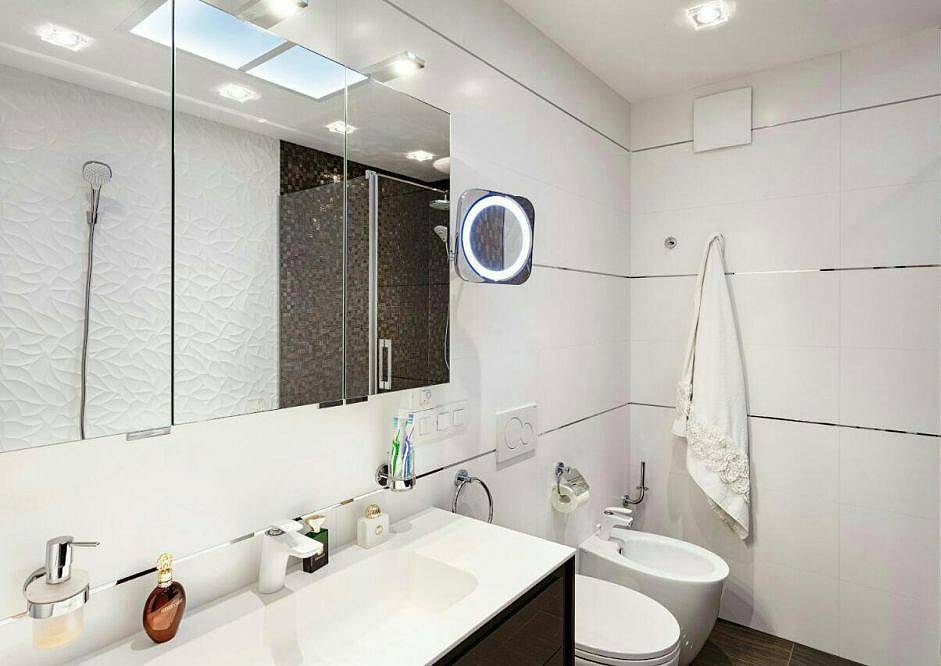 На обычном окрашенном потолке часто устанавливают подвесные светильники с повышенной защитой от влажности. Для потолочной плоскости, оформленной гипсокартонной конструкцией, пластиковыми панелями или рейками, предпочитают встроенные светильники. Они являются очень удобными, эстетичными и безопасными, так как имеют спрятанную проводку. В случае натяжного полотна подойдет точечное освещение, а для многоуровневого потолка будут уместны светодиодные лампы.