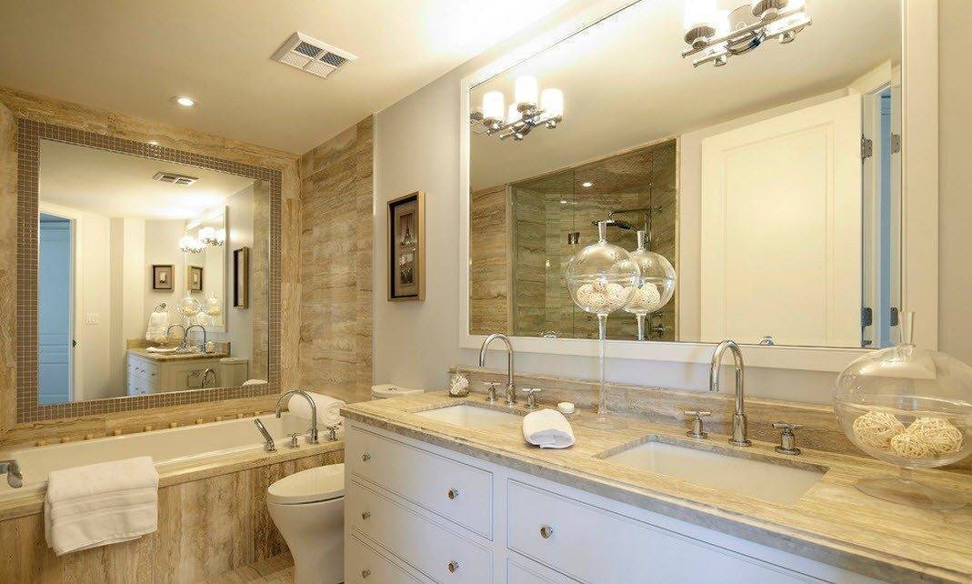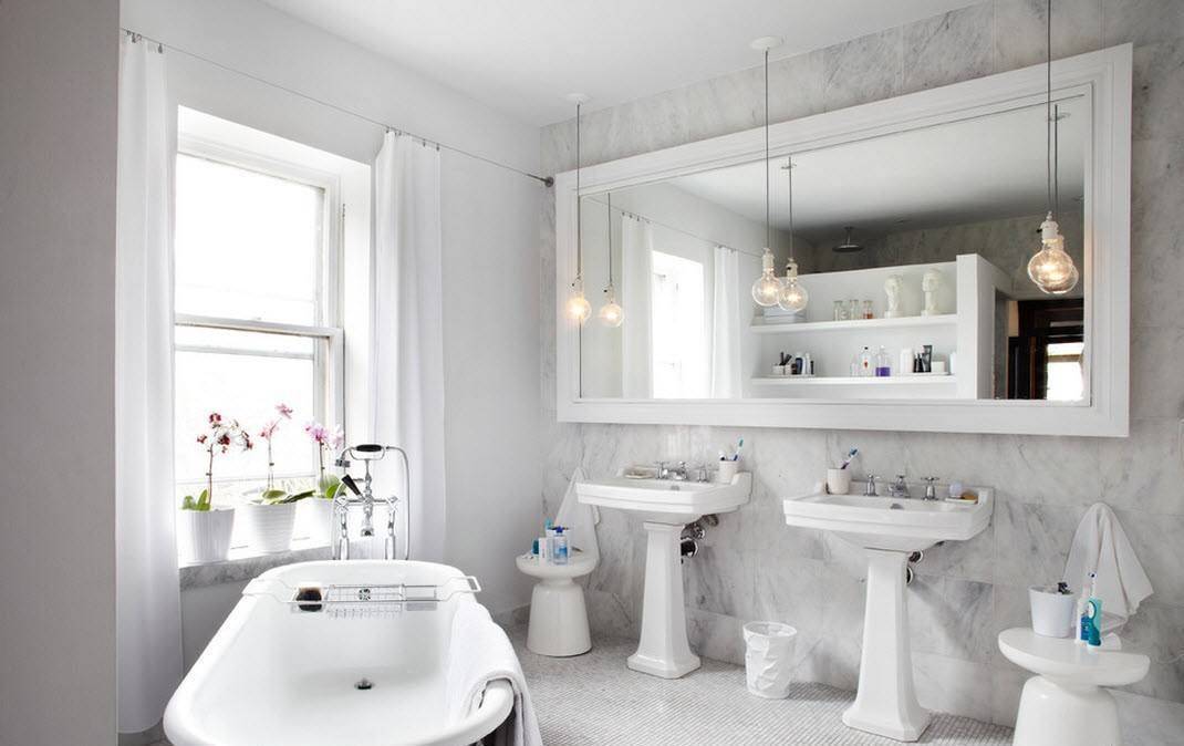 В больших ванных комнатах используются зеркала во всю стену. Выбираются либо навесные, либо вмонтированные в стену модели. Помните: горизонтальные аксессуары расширяют пространство, а вертикальные – увеличивают его высоту.
