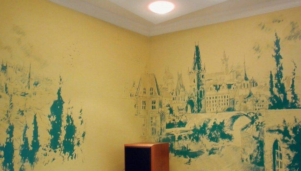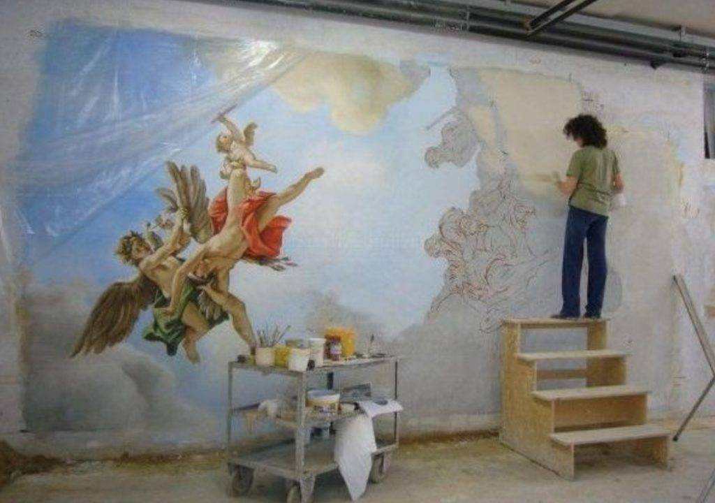 Смысл данной техники состоит в том, что рисунок наносится на стену еще до высыхания штукатурки. Вначале на поверхность накладываются светлые тона, затем поочередно выполняются более темные, насыщенные и яркие элементы.