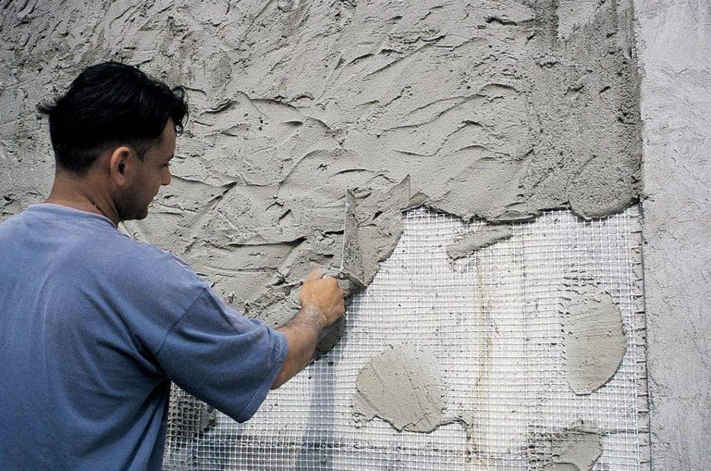 Для более крепкого сцепления делают перфоратором или отбойным молотком неглубокие выбоины на стене.