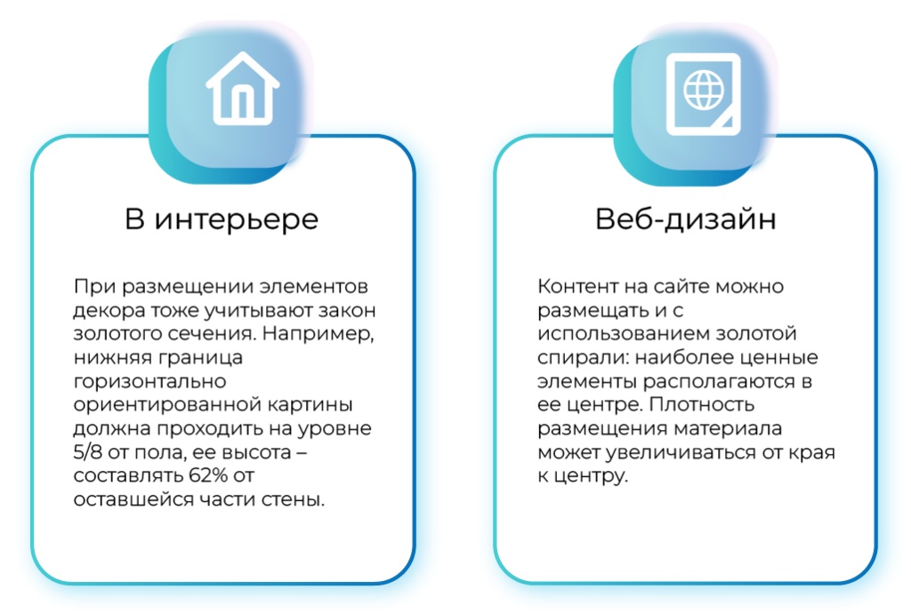 Золотая пропорция визуально создает ощущение гармонии. Чем ближе к идеалу пропорции предметы или элементы и их соотношение друг с другом, тем лучше человеческим мозгом воспринимается общая картина.