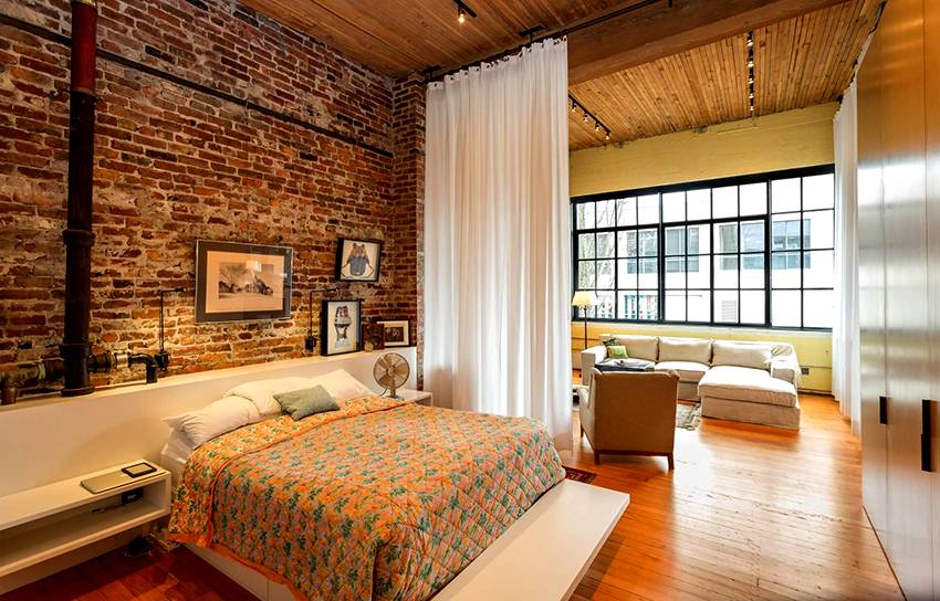 Кроме того, такую перегородку легко создать своими руками, придерживаясь пошаговых инструкций. Если возникнет необходимость, ширму можно сложить и спрятать в шкаф. Такие конструкции нередко называют фальш-перегородками, поскольку они осуществляют разделение пространства, но при этом не отделяют друг от друга зоны. Чаще всего такой дизайн присущ стилю лофт. Для примера предоставляем вашему вниманию фото дизайна спальни гостиной с использованием статичных перегородок.