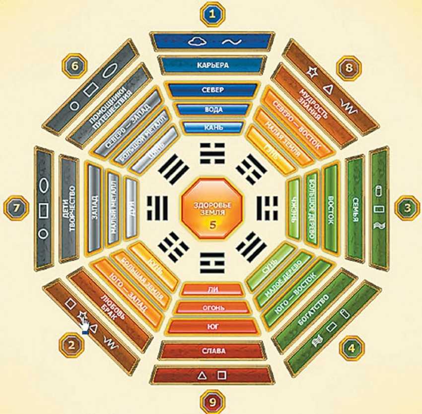 Количество — 8. Стихия — Малая Земля. Ответственность за все, что связано с образованием. Этот сектор необходимо активировать для поступления, сдачи экзаменов или просто, если вы хотите, чтобы дети хорошо учились. Для активации используются символы огня и земли, такие как свечи или каменная пирамида.