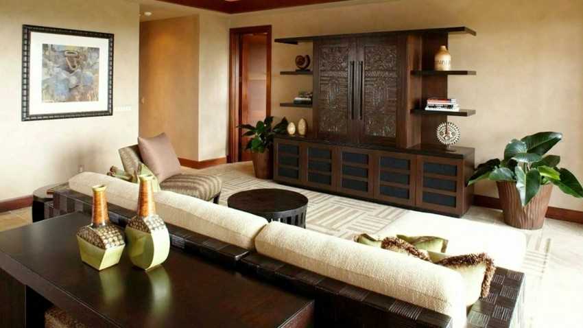 Гостиная не любит острых углов и предметов. Выбирая мебель, нельзя об этом забывать. Круглые столы, мягкие кресла, горка с овальными формами придадут комнате жилой вид. Даже растения не должны иметь острых листьев.